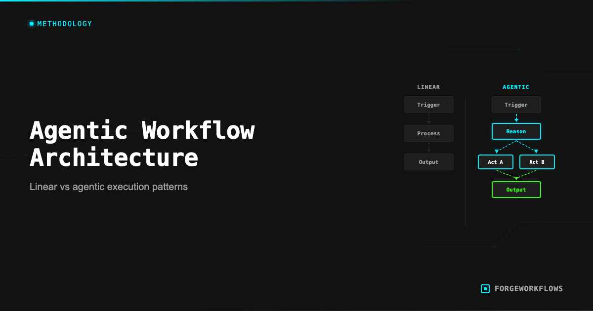 Cost also matters. A linear workflow that moves data between systems costs nothing in LLM inference. An agentic workflow costs per execution (typically $0.01-$0.15 per run for ForgeWorkflows Blueprints). For high-volume, low-judgment tasks, the cost arithmetic favors linear.
