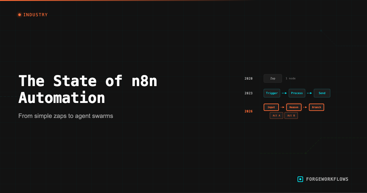 The shift is not binary — many teams still use Zapier for simple automations and n8n for complex ones. But for the category of workflow that ForgeWorkflows serves (multi-agent reasoning pipelines with CRM, communication, and LLM integrations), n8n is the clear platform choice.